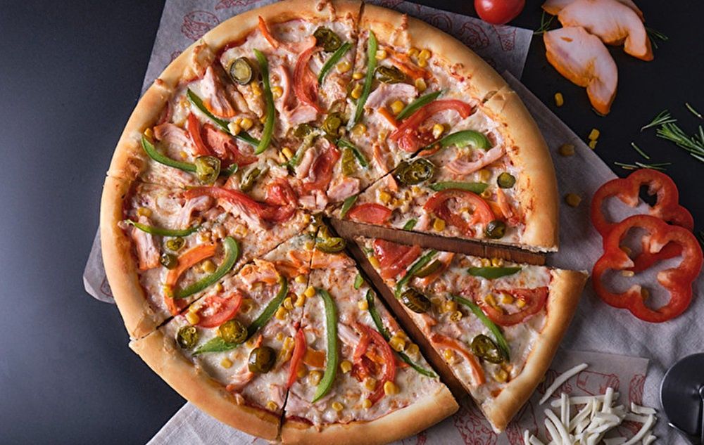 Томатный соус, болгарский перец. копченая курица, сыр моцарелла холопенью, кукуруза, сладкий лук