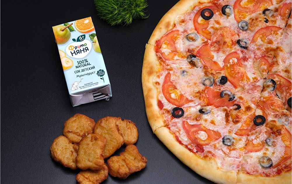 Пицца маргарита, наггетсы, сок, подарок