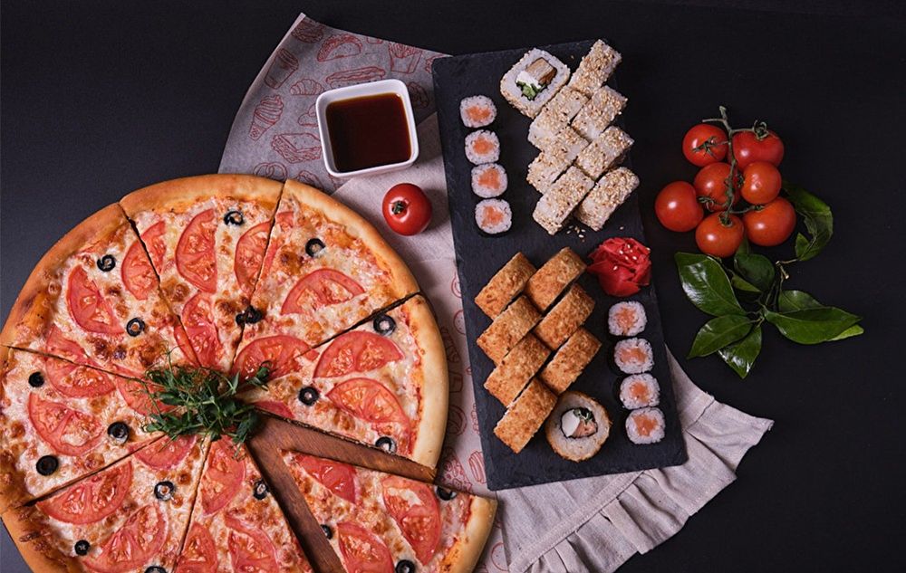 Пицца маргарита, америка, в кунжуте, сяке маки