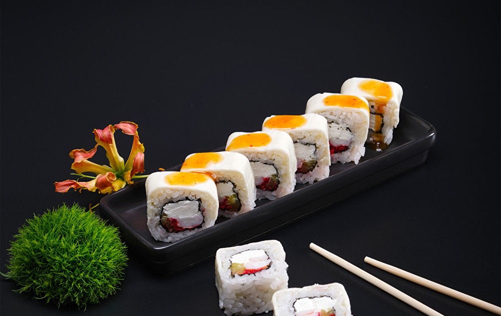 Творожный сыр, креветка, икра масаго, соус чили-манго, дайкон