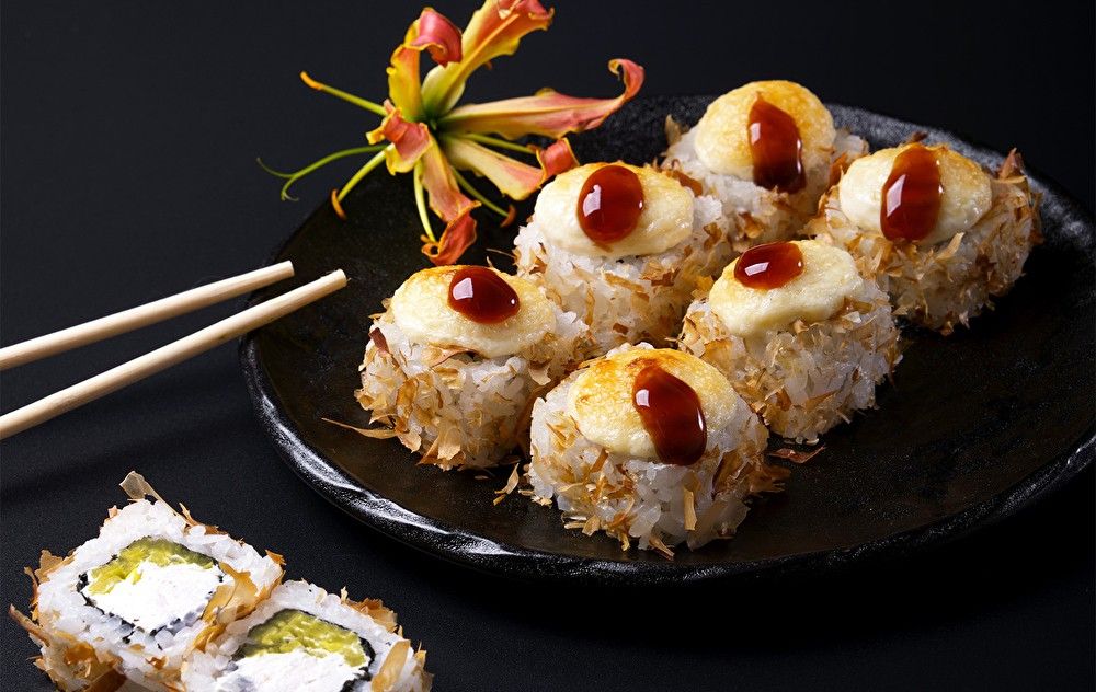 Стружка тунца, дайкон, сырная шапочка, соус BBQ