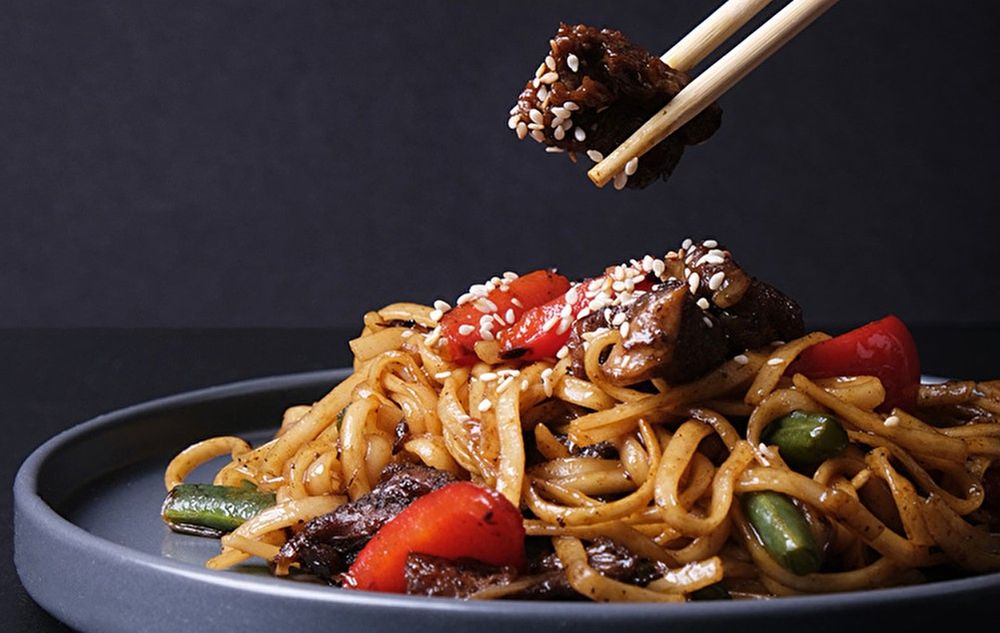 Соба, говядина, болгарский перец. стручковая фасоль, лук, терияки соус