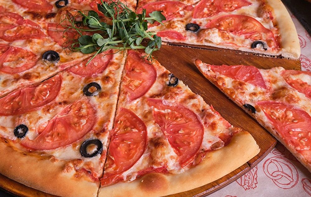 Томатный соус, помидоры, маслины, сыр моцарелла