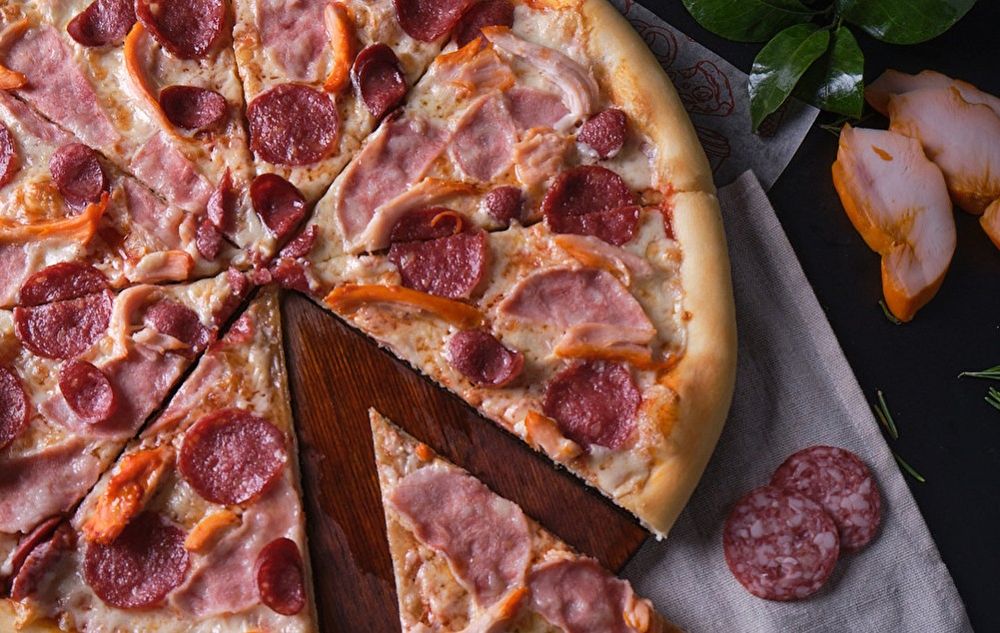 Томатный соус, ветчина, охотничьи колбаски, салями, курица, сыр моцарелла